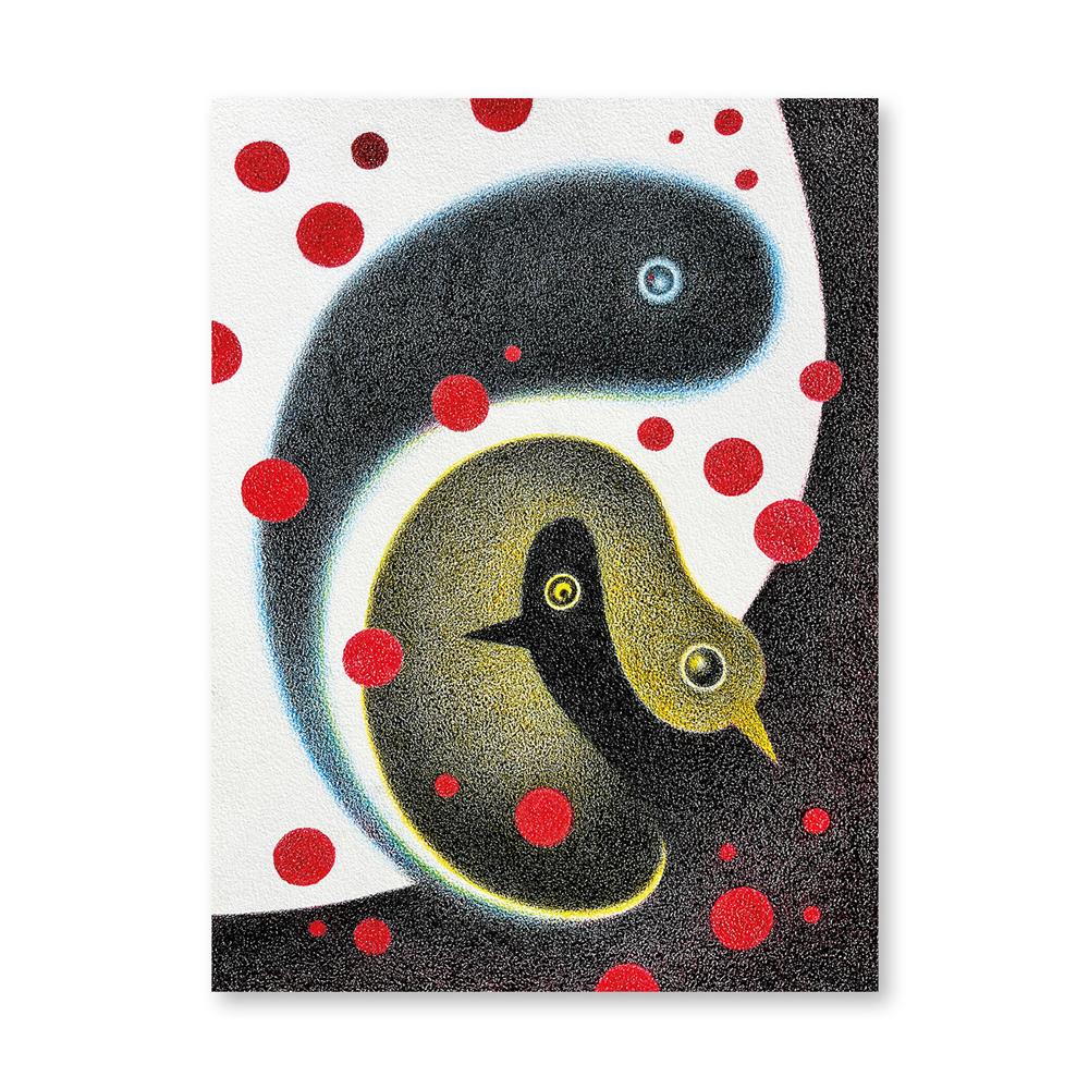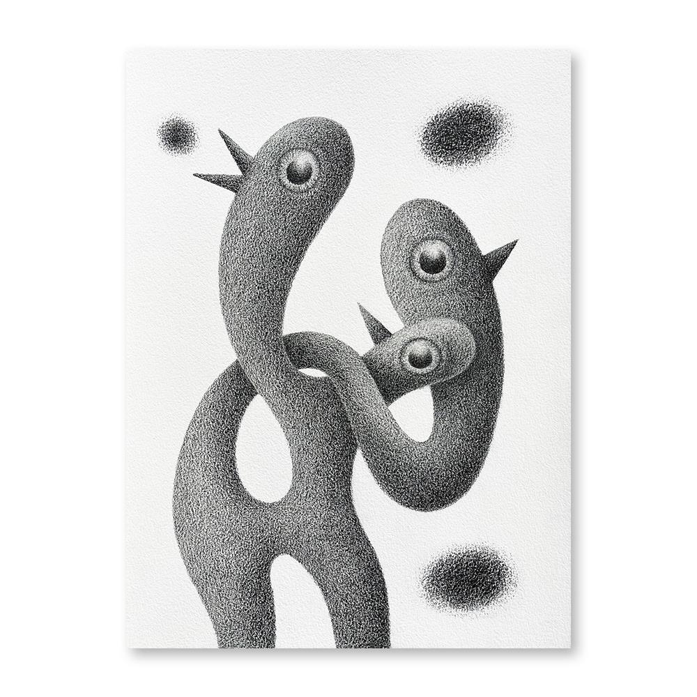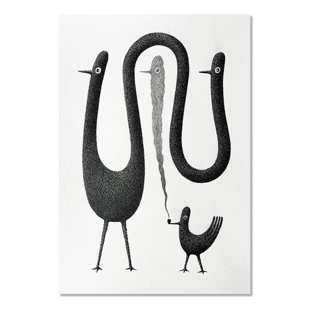 It all started with drawings of penguins—wobbly, whimsical figures that allowed for a dancing line quality. Over time, these evolved into bird‑like creatures that often serve as symbols for the complexity of human relationships and family ties.