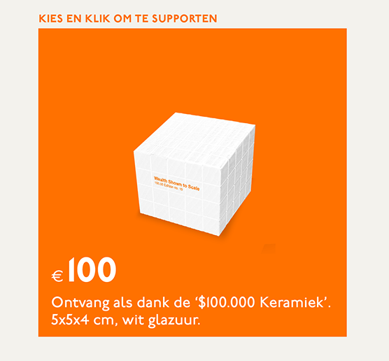 Het vermogen van Jeff Bezos, oprichter van Amazon en eigenaar van The Washington Post. 185 kubieke meter Een oranje ruimte van 9,6 bij 6,4 bij 3 meter, net zo groot als Bezos zijn $185 miljard. Het oranje blokje van 1x1x1cm dat je straks in je hand houdt, staat in deze ruimte symbool voor $1000.