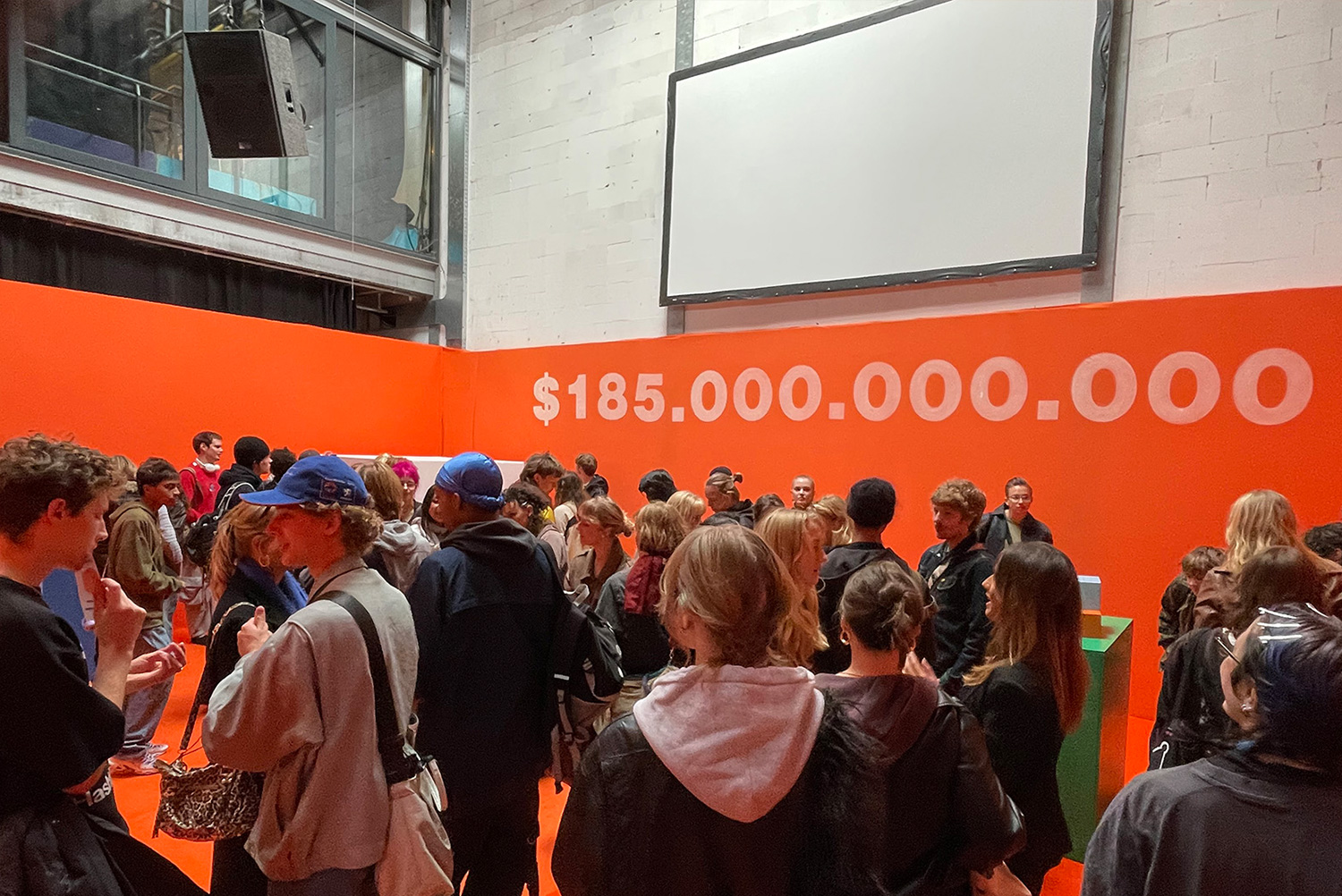 The color orange plays an important role as a warning. The chosen form—a gigantic space visualizing wealth, opposite a minimal orange block of 1 × 1 × 1 centimeter that represents $1,000—emphasizes inequality.